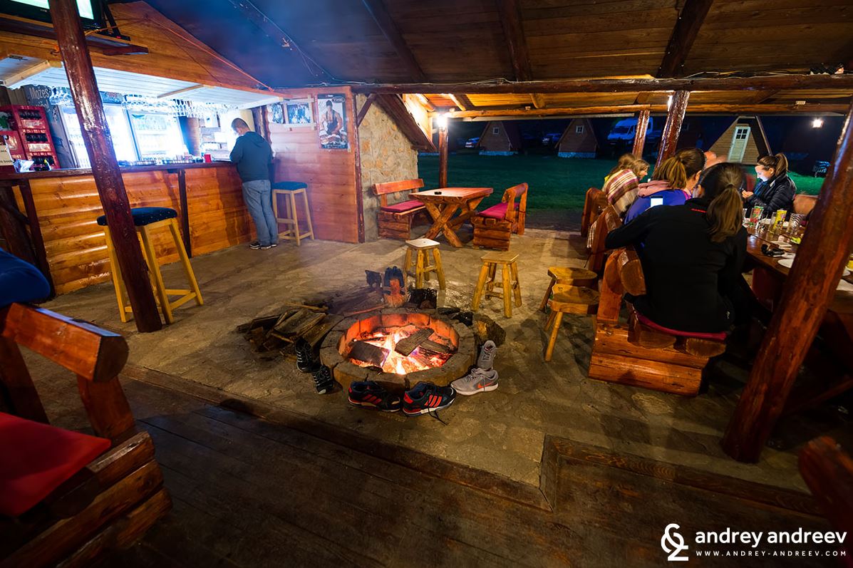 Twenty minutes after returning to Rafting Center Drina-Tara the view at the restaurant was quite charming: seated around the large tables people were using blankets (2-3 people under one) to warm up while drinking excessive amounts of wine. Shoes were gathered around the camp fire and so were those who froze the most during the day. Ellie and I were floating from table to table, talking with just about everyone who was in the camp (even people we didn’t yet know). Turned out the fact that there was no reason to stay in the bungalows helped us make some cool new friends. Thanks, Rafting Center Drina-Tara!